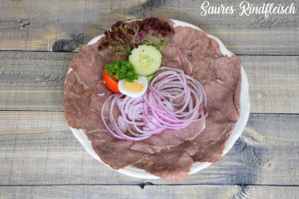 Saures Rindfleisch – fein aufgeschnitten mit Zwiebel und Kernöl